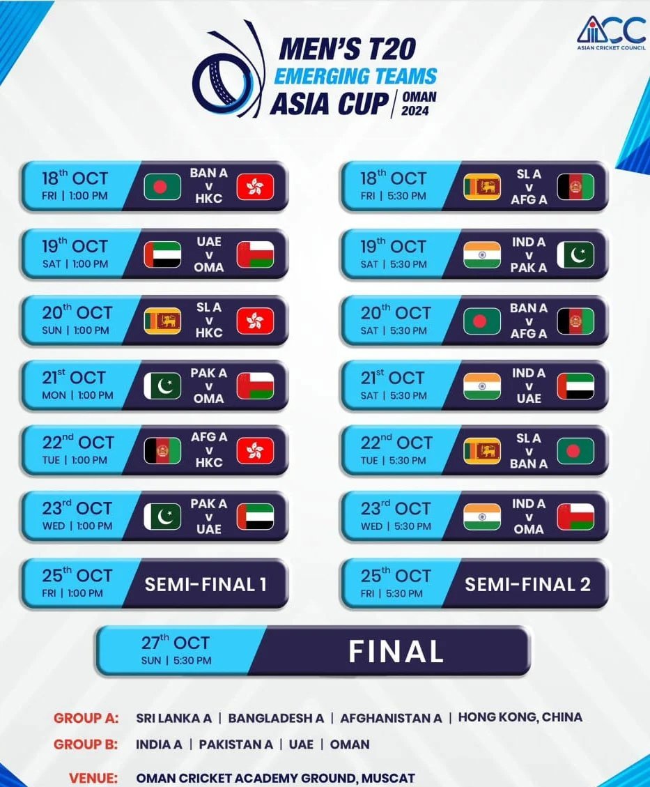 The Asian Cricket Council (ACC) has announced the schedule for the Men’s T20 Emerging Asia Cup 2024.