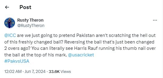 American cricketer Rusty Theron has accused national fast bowler Haris Rauf of ball tampering during the match against USA in the T20 World Cup.