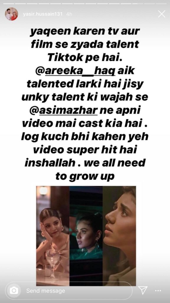 Yasir said that Tiktok has more talent than television and that Asim featured Haq because of her talent.