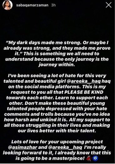 “Please be kind towards each other,” asserted Saba. “Learn to support each other. Don’t make these beautiful, young talented people depressed with hate comments and trolls because you have no idea how harsh and unkind it is.”