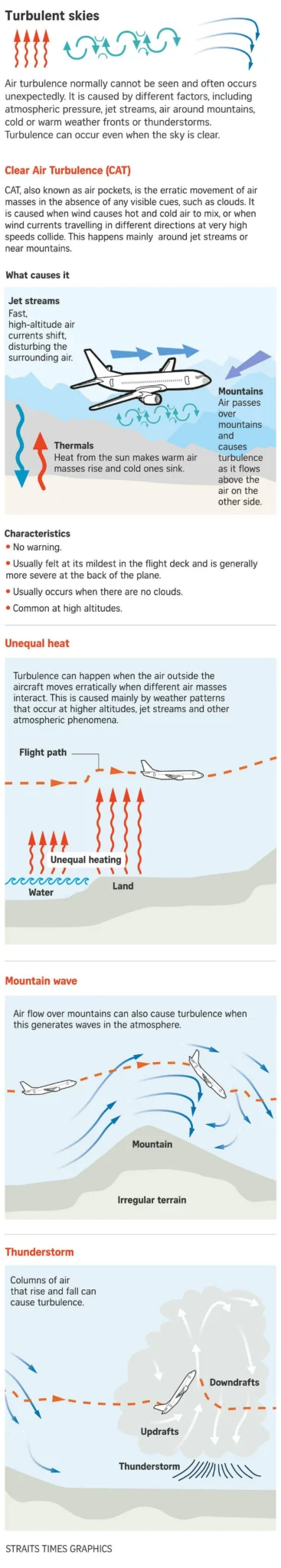 Air turbulence often occurs unexpectedly. It is caused by different factors, including atmospheric pressure, jet streams, air around mountains, cold or warm weather fronts, or thunderstorms. It can also occur when the sky is clear.