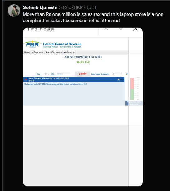To put more fuel to the fire, a citizen named Sohaib Qureshi, claiming to be an expert on E-Commerce, shared that the company The Laptop Store, with which the Ombudsman has placed an order, is allegedly non-filer. To prove his claim, Sohaib attached a screenshot from the FBR website where the company has no record of tax to its name. “More than one million is a sales tax but this laptop store is non compliant in sales tax,” Sohaib wrote.