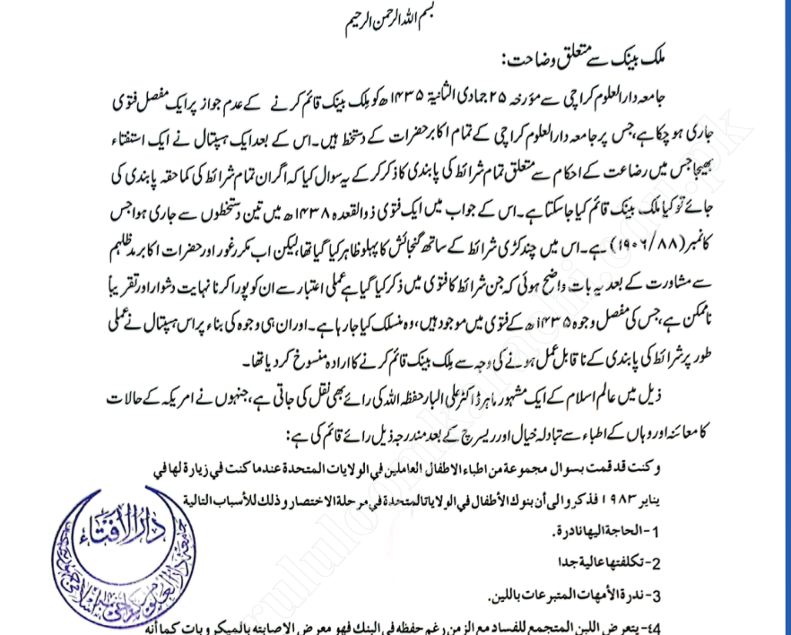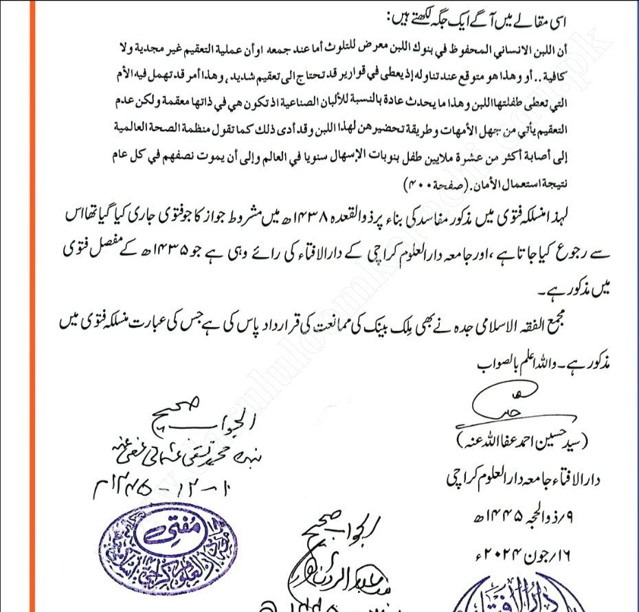 The revised Fatwa available on Dar ul Uloom Karachi’s official website includes a detailed analysis of the establishment of a milk bank that did not comply with Shariah laws because of the demanding maintenance of the concept of kinship at the facility as observed by the scholars sitting in Dar ul Ifta. It quotes an American scholar and a Jeddah’s Islamic think tank declining the establishment of a milk bank along with a detailed note from Mufti Taqi Usmani extrapolating other religious concerns entailing the issue of breast milk bank but no word on the specific issue of the establishment of milk bank in the city.