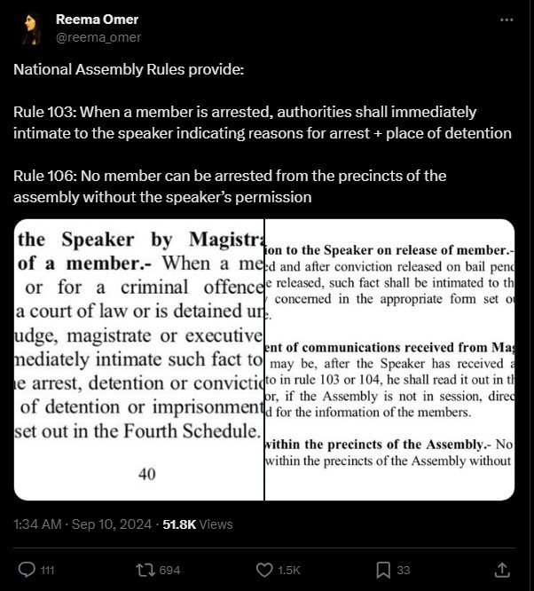 Lawyer and analyst Reema Omer also posted about Rule 106 and highlighted Rule 103, which delineates that “when a member is arrested, authorities shall immediately inform the speaker indicating reasons for arrest plus place of detention.”