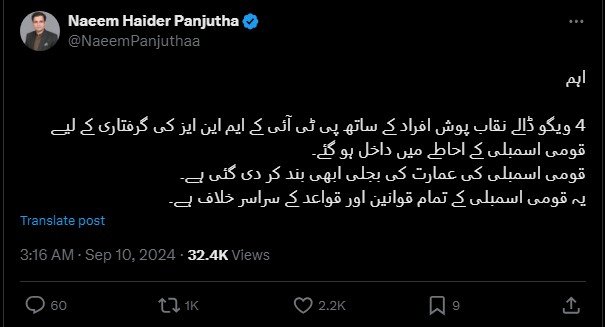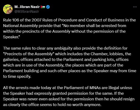 Lawyer and activist Jibran Nasir posted a detailed note elaborating upon the law rule 106 of the 2007 Rules of Procedure and Conduct of Business in the assembly stating that “No member shall be arrested from within the precincts of the Assembly without the permission of the Speaker.”