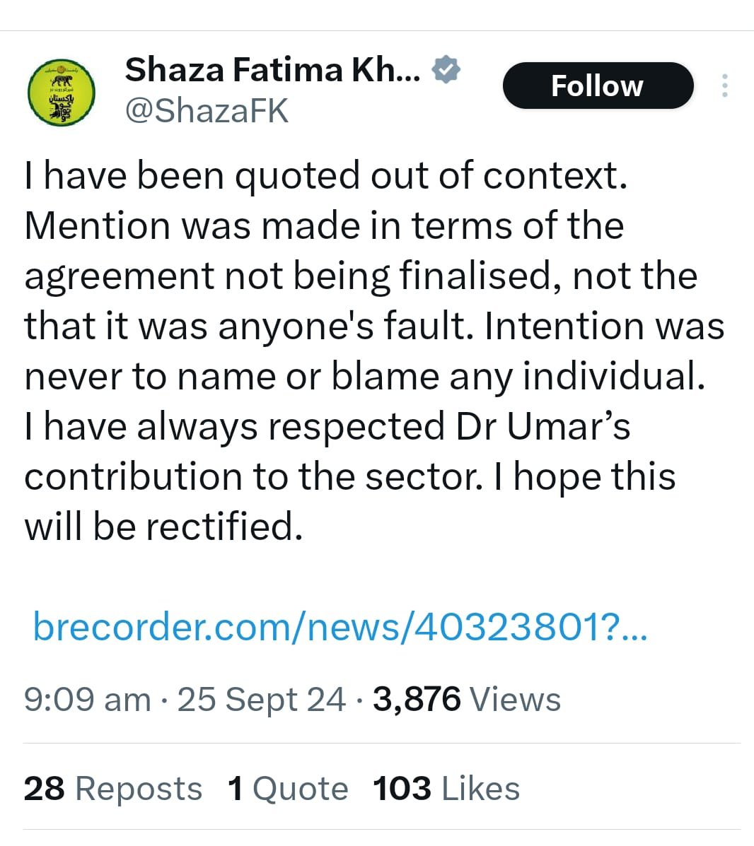 The Current talked to Shaza Khawaja about her statement. “The comment was mainly that he deal was private and it didnt go through with no intention of accusing anyone,” she stressed. While mentioning her tweet, in which she said, “I have always respected Dr. Umar’s contribution to the sector,” she added that she had tweeted about it and made an official statement about it as well.