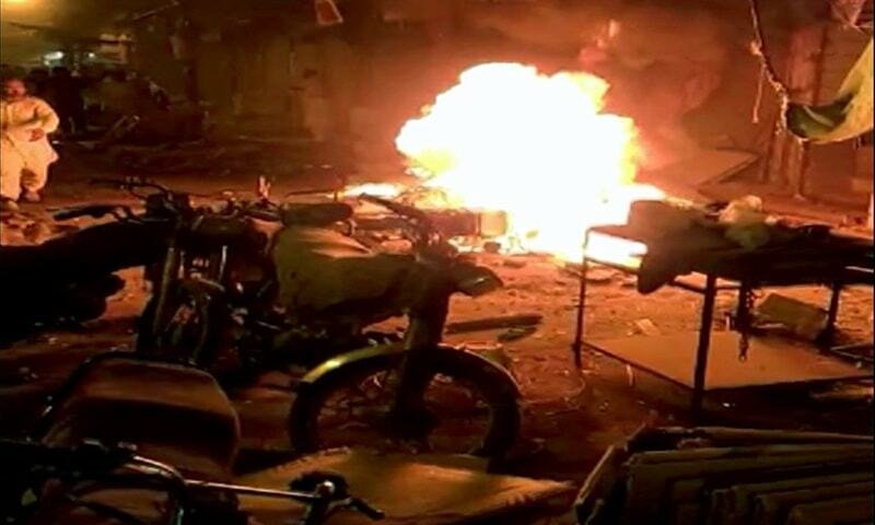 According to television footage, motorcycles, rickshaws, and a police car were damaged, with people attempting to put out the flames. While the actual origin of the explosion has yet to be determined, residents believe it was triggered by an explosive device mounted to a two-wheeler.