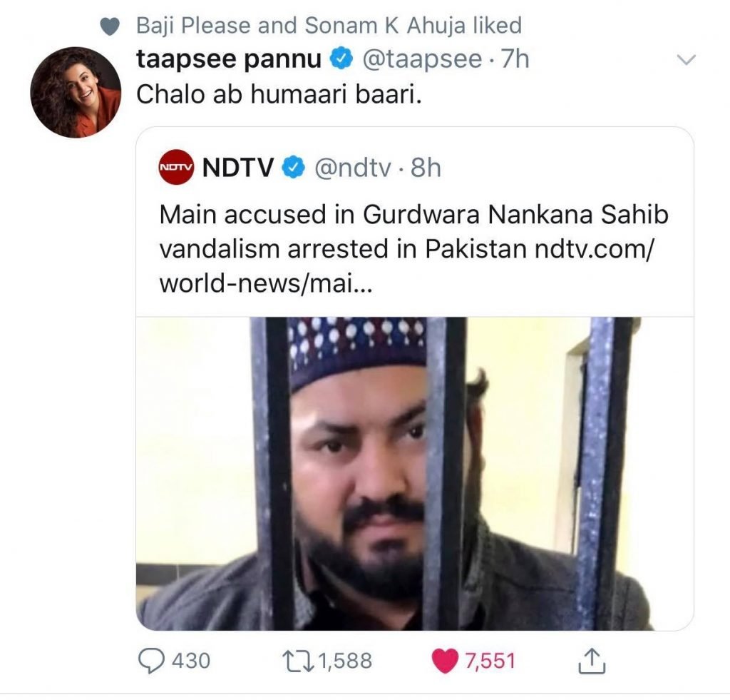 Taapsee Pannu, known for her roles in Pink, Manmarziyaan and Judwaa 2 also called for swift action to be taken against the perpetrators of violence. Sharing the news of Pakistan arresting the prime suspect in the Nankana attack case, Taapsee remarked that India should follow suit and do the same.