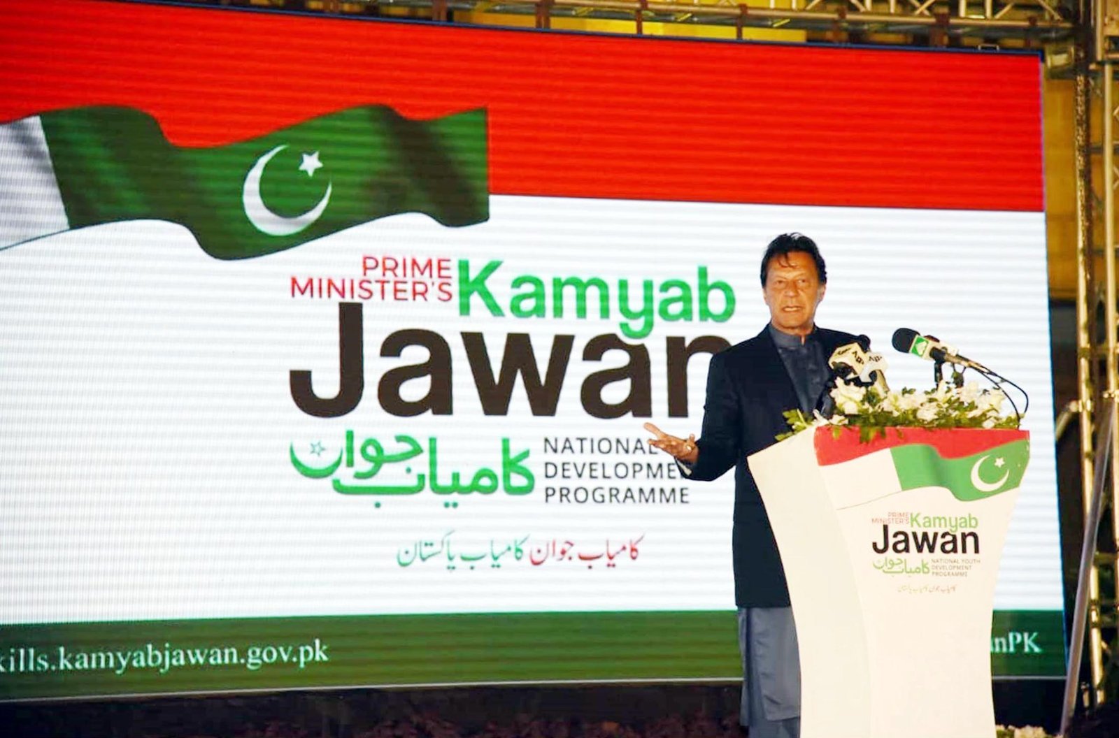 Prime Minister Imran Khan addressing after distribution of Cheques at a Ceremony under “Kamyab Jawan Program” in Karachi on January 27, 2020