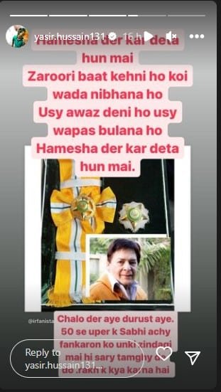 Hussain shared a screenshot of the award on Instagram and quoted lines from the celebrated poem ‘Hamesha Dair Kardeta Hoon’ by Muneer Niazi.