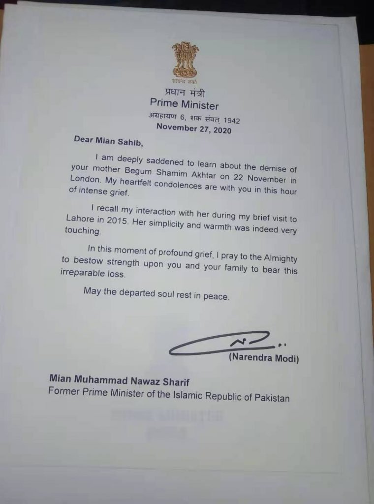 Indian Prime Minister (PM) Narendra Modi wrote a letter to former premier Nawaz Sharif to offer his condolences after the death of the latter’s mother Begum Shamim Akhtar, it has emerged.