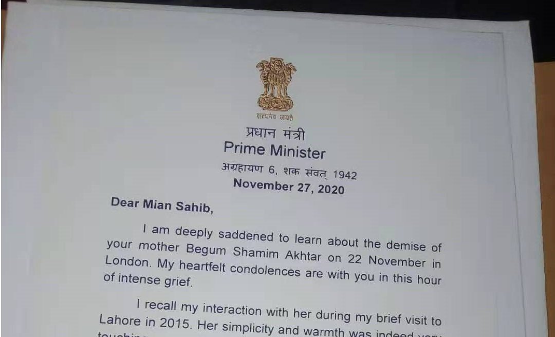 “I am deeply saddened to learn about the demise of your mother Begum Shamim Akhtar on November 22 in London. My heartfelt condolences are with you in this hour of intense grief,” wrote the Indian premier.