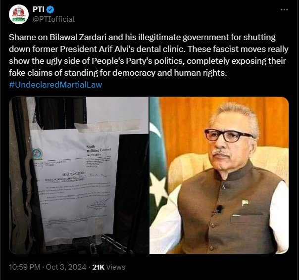 The former President’s son Awab Alvi took to X (formerly Twitter) to share their side of the story in which he claimed that first, a motorcyclist without a number plate surveyed the area and then a group of people arrived, claiming to be from Sindh Healthcare commission asking to be allowed inspection of the clinic but they left. Eventually, by night a team of “heavy handed thugs arrived” claiming to be from SBCA and sealed the clinic after a heated argument.