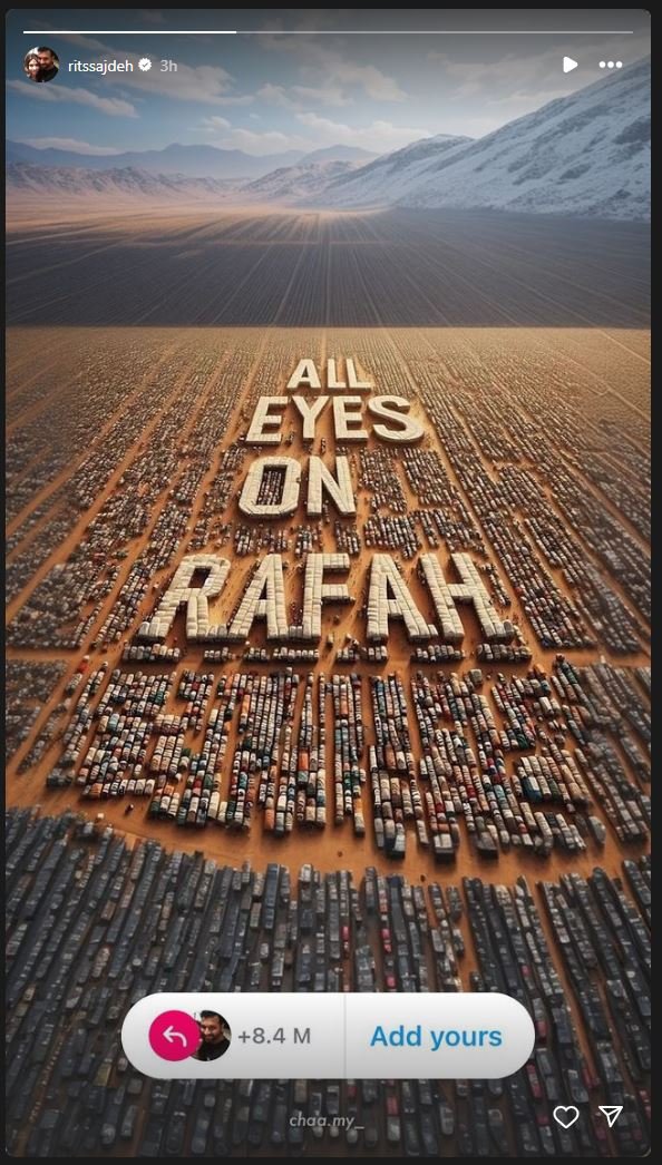 The viral post (All Eyes on Rafah) on social media against Israeli atrocities refers to the genocide of Palestinians in the Rafah region of Gaza, where more than 1.4 million Palestinians are seeking asylum.
