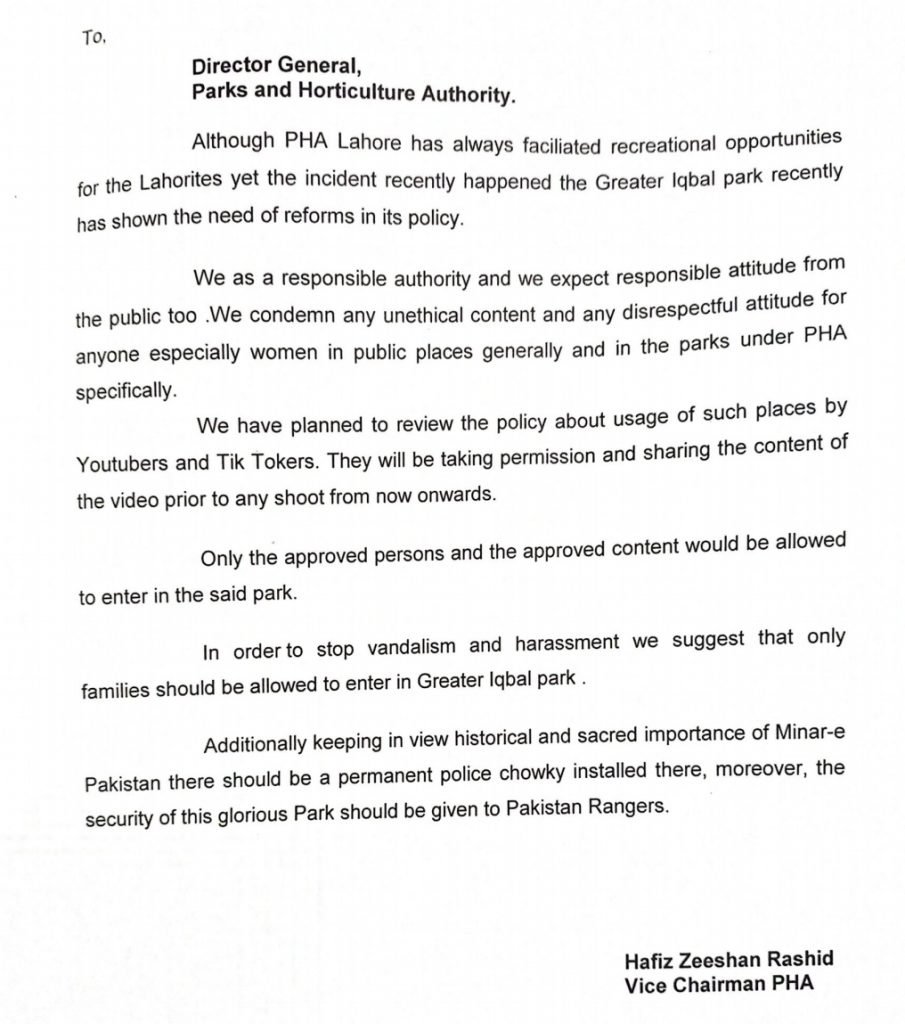 The notice has been making rounds on social media platforms since yesterday following the Minar-e-Pakistan incident in which Ayesha Akram, a TikToker survived a mass sexual assault on August 14.