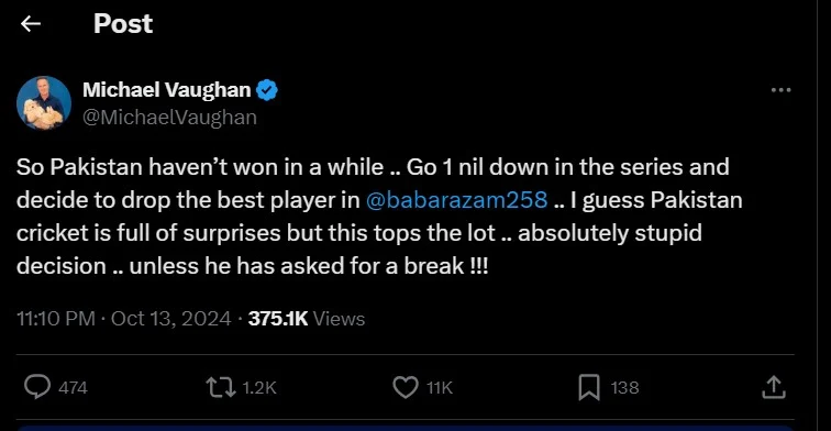 Michael tweeted on X (previously Twitter): “So Pakistan hasn’t won in a while; go one nil down in the series and decide to drop the best player. I guess Pakistan cricket is full of surprises, but this tops the lot. It is an absolutely stupid decision unless he has asked for a break.”