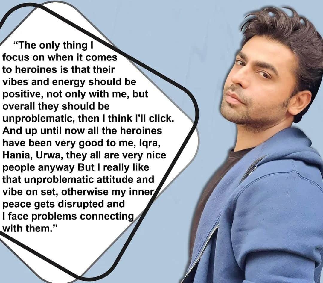 Farhan added, “Until now all the heroines have been good to me, be it Iqra Aziz, Hania Aamir or even Urwa Hocane, they all are very nice people anyway but I really like unproblematic attitude, otherwise inner peace gets disrupted and I face problems in connecting with them.”