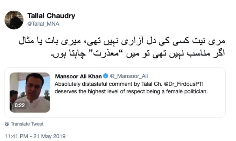 This is not the first time Talal has come under fire for passing derogatory and sexist remarks. Earlier his comments on Firdous Ashiq Awan has sparked social media outrage.