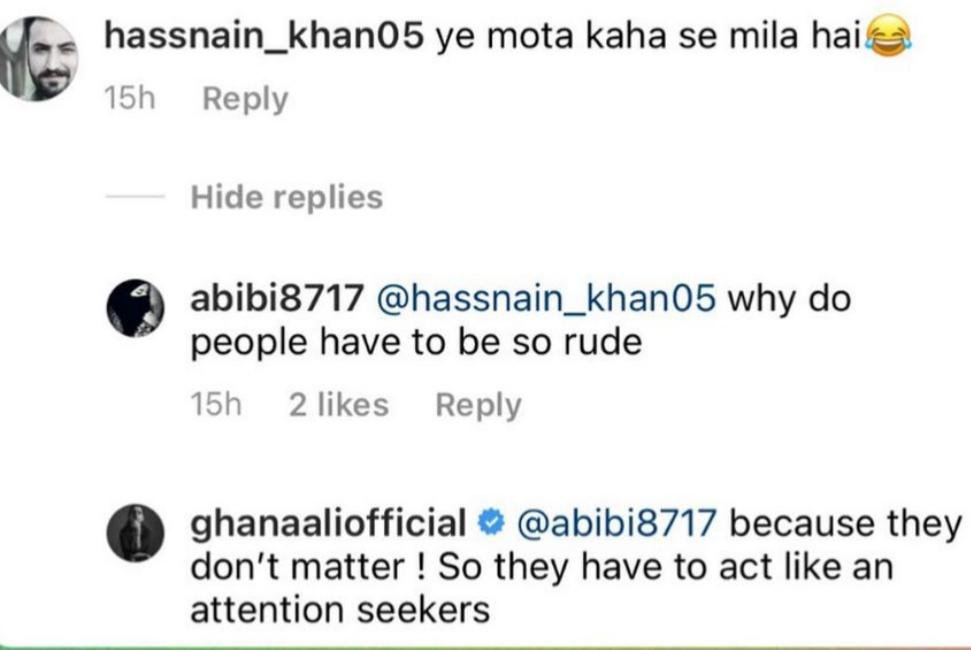 Sun Yaara actor Ghana Ali, who tied the knot with businessman Umair Gulzar, has responded to mean comments of netizens who body shamed her husband.