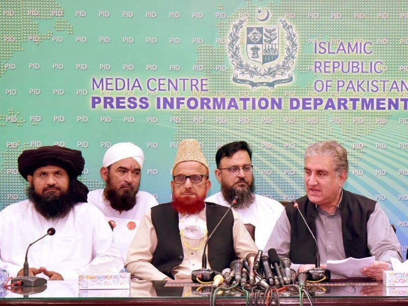 The government’s negotiating team members Foreign Minister Shah Mahmood Qureshi, National Assembly Speaker Asad Qaiser, and Minister of State for Parliamentary Affairs Ali Mohammad Khan, along with Mufti Muneeb-ur-Rehman were present at the press conference.