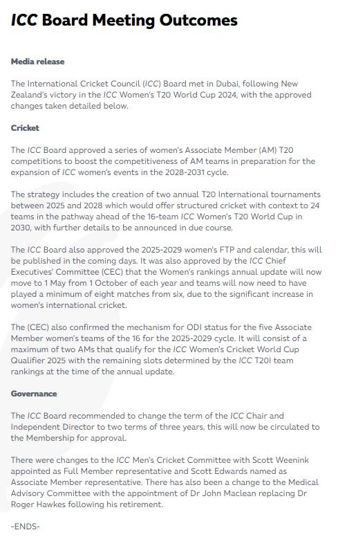 The ICC decided to conduct the Associate Members Series to improve the quality of women’s cricket and also decided to increase the number of women’s teams in future ICC events. The ICC Board also approved the new Future Tour program of Women’s Cricket 2025-29.