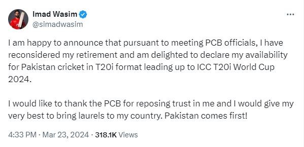 Imad Wasim wrote , “I am happy to announce that pursuant to meeting PCB officials, I have reconsidered my retirement and am delighted to declare my availability for Pakistan cricket in T20i format leading up to ICC T20i World Cup 2024.”