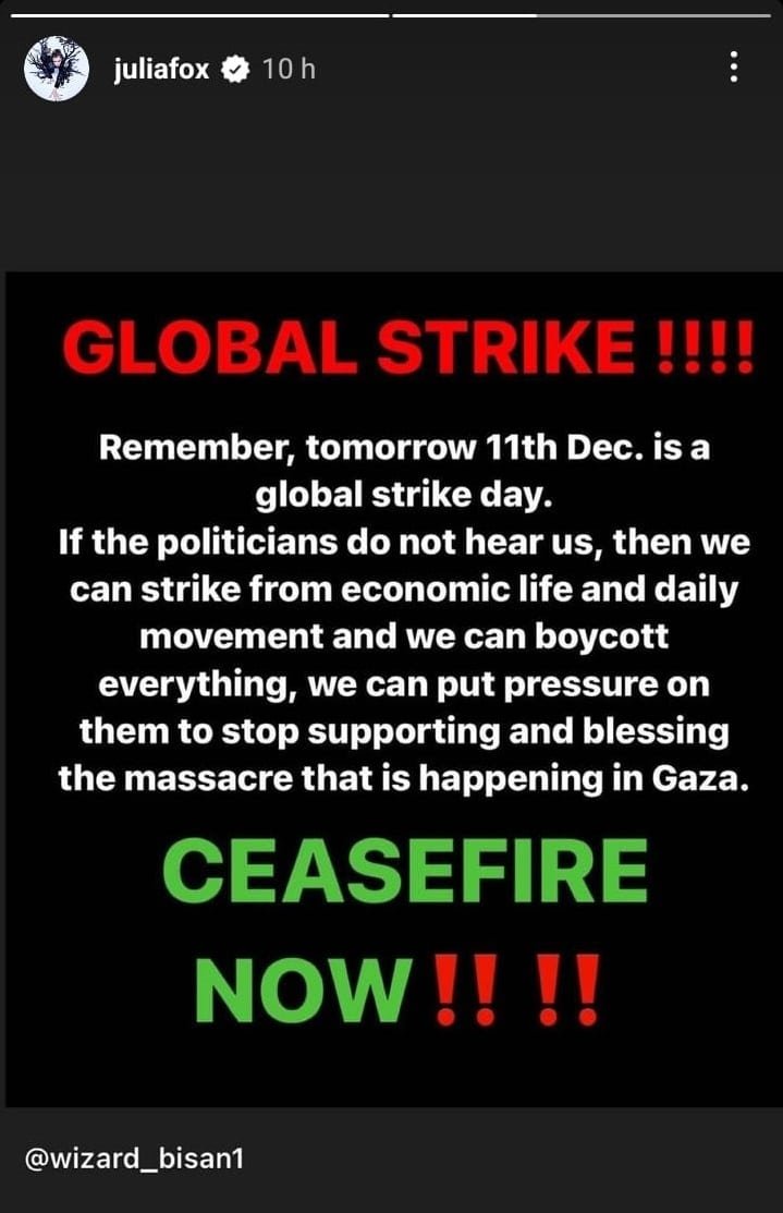 Previously, Fox had signed a petition by shared by Gal Gadot in support of Gaza. Now, however, she joined the call for Global Strike for Palestine.