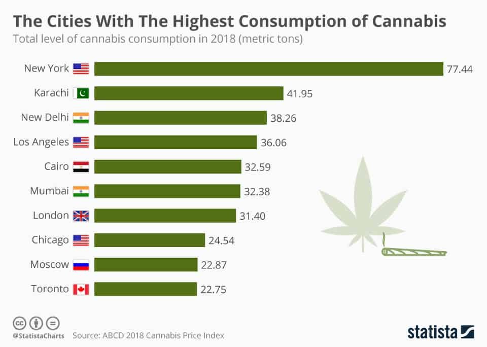 New Delhi is right behind Karachi at 38.26 metric tonnes. Mumbai is also in the top ten. Interestingly, Amsterdam did not make it to the top 10 considering how popular the drug is in the city.