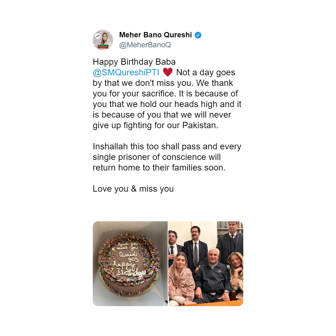 Meher Bano wrote to her father, “Happy Birthday Baba @SMQureshiPTI ♥ Not a day goes by that we don’t miss you. We thank you for your sacrifice. It is because of you that we hold our heads high and it is because of you that we will never give up fighting for our Pakistan. Inshallah this too shall pass and every single prisoner of conscience will return home to their families soon. Love you & miss you.”