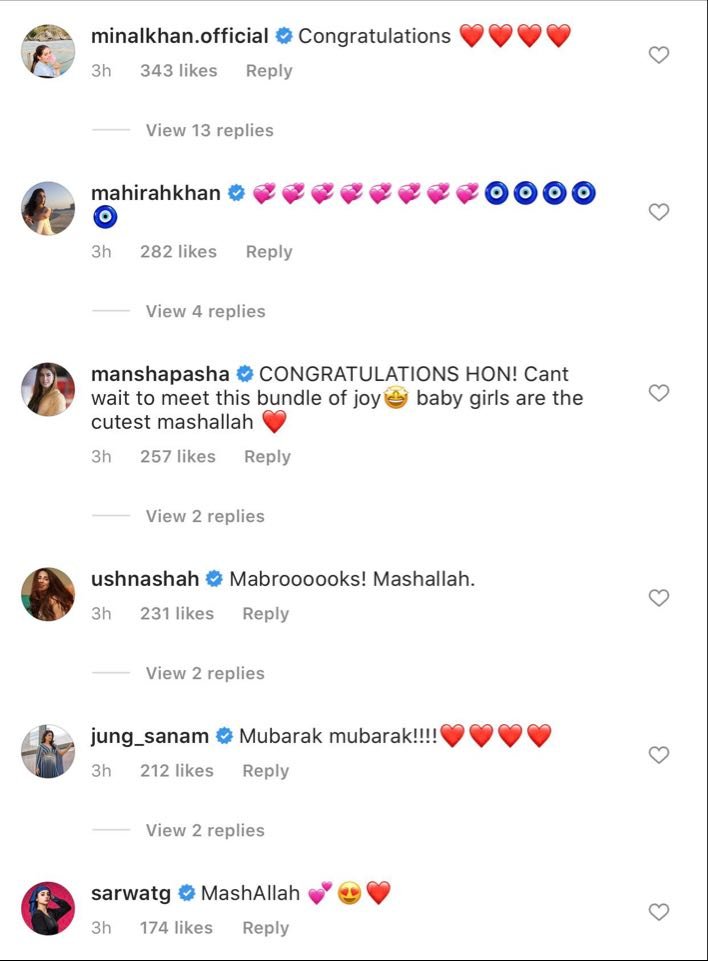 Friends and colleagues, including Mahira Khan and Sarwat Gilani, congratulated the happy parents and sent their best wishes.