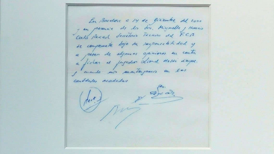 The napkin, inscribed in blue ink, is also signed by then-Barcelona director Carles Rexach, the club’s transfer adviser Josef Manguela and Messi’s first agent Oracho Guijoli.