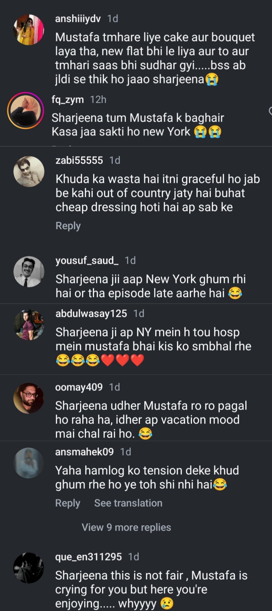 Another commented, “Sharjeena ji Mustafa ko aur pareshan mat karo, he’s heartbroken, but you’re out there enjoying New York. It’s not fair!”