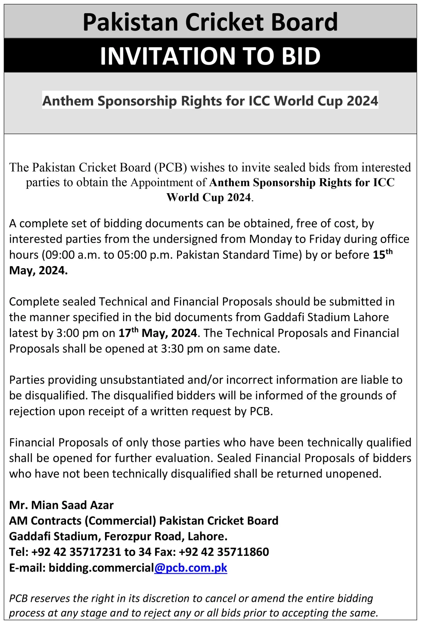 PCB has advertised for anthem sponsorship rights on their official website.