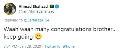 Among those who sent their good wishes was Ahmad Shehzad, who not only congratulated Sarfaraz but also told him to “keep going”.