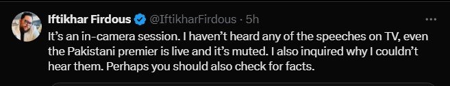 “It’s an in-camera session. I haven’t heard any of the speeches on TV, even the Pakistani premier is live and it’s muted. I also inquired why I couldn’t hear them”, he wrote on X (formerly Twitter)