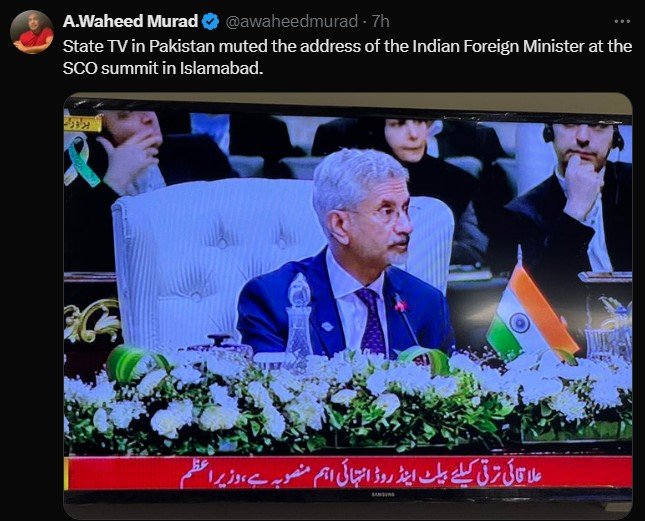 A social media user on X (formerly Twitter) named A Waheed Murad wrote, “State TV in Pakistan muted the address of the Indian Foreign Minister at the SCO summit in Islamabad.”