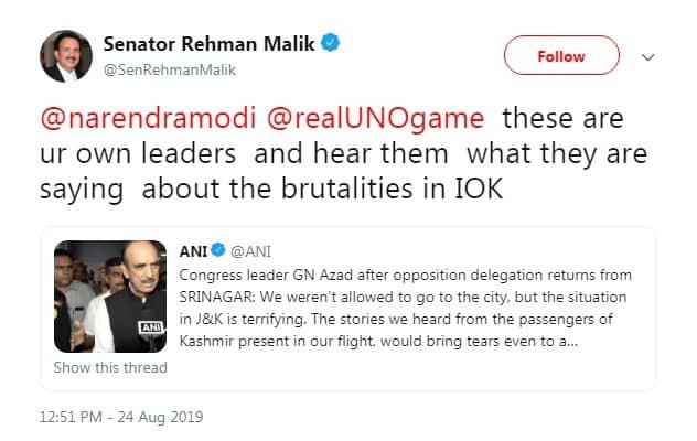 The former interior minister has been openly criticising the Modi government for their atrocities in Kashmir and has even written a letter to the Office of United Nations High Commissioner for Human Rights (OHCHR) in this matter. The senator has demanded that the UNHCR constitute a parliamentary committee consisting of parliamentarians from different countries and make them visit Indian Held Kashmir (IHK) and observe the worst kind of human rights violations there.