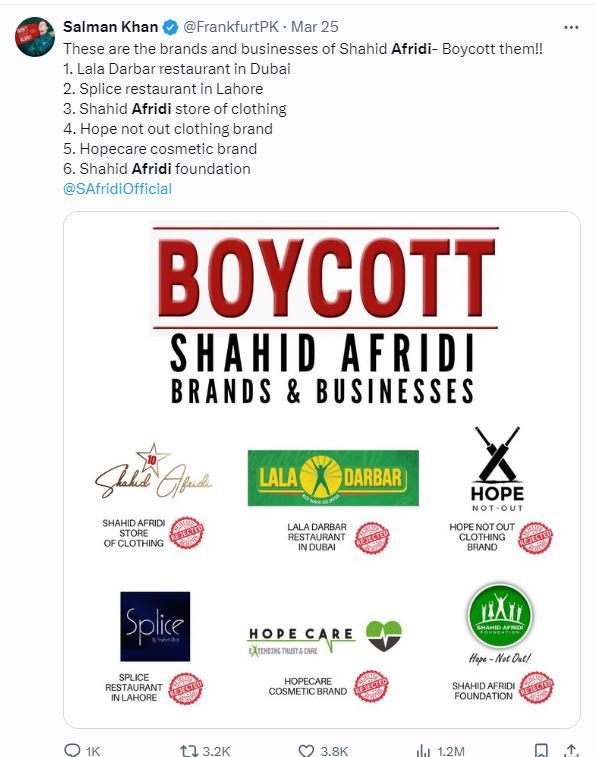 One such user wrote in a post on X that all brands of Shahid Afridi should be boycotted.