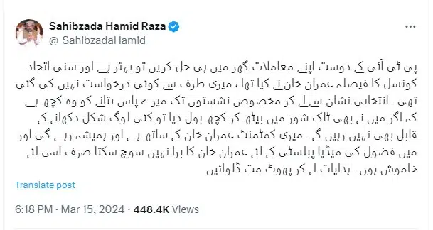 Raza wrote on X (former Twitter), ” It is better that PTI friends resolve the matters internally and Imran Khan made the decision of Sunni Ittehad Council, I didn’t make any request. From electoral symbol to reserve seats I have so much to tell that if I say something in a talk show then these people won’t be able to show their faces.”