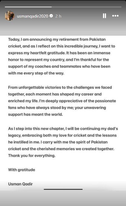 In the social media post, Usman expressed gratitude for his journey with the national cricket team. “I’m thankful for the support of my coaches and teammates who have been with me every step of the way,” he posted.
