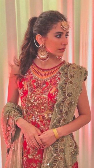 Syra looked lovely in a bright red outfit by Tena Durrani and hair swept in a pony tail.