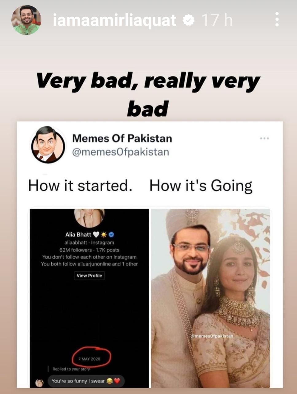 Former PTI National Assembly member Aamir Liaquat has reacted to a fabricated screenshot which portrayed a morphed chat between the Bas Karo Na actor and Bollywood actress Alia Bhatt.