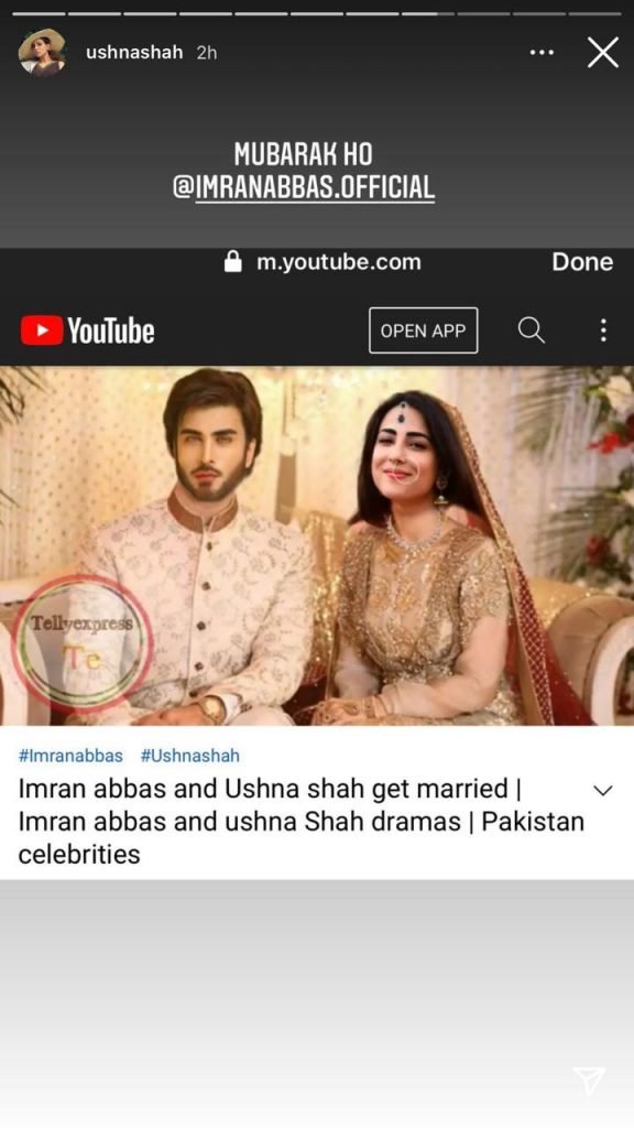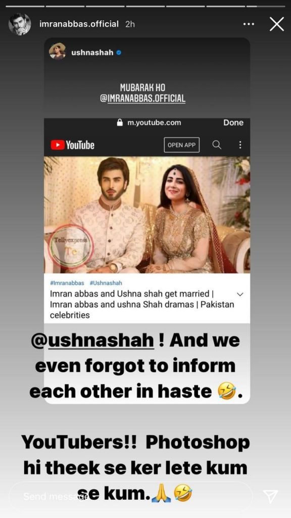 Shah took to her Instagram stories with a screenshot of a thumbnail of a YouTube video with a photoshop photo of Imran and herself saying that Ushna and Imran are married.