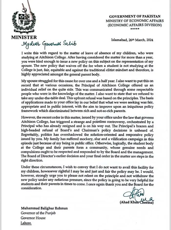 Ahad Cheema the federal Minister for Economic Affairs, is currently a subject of backlash for using his position to get a fee waiver for his children at Aitchison College. The waiver was requested by his wife, Saima Ahad Cheema, who is also a bureaucrat, with the request that since their two children did not attend Aitchison college for three years, but kept their seats, they shouldn’t be required to pay. They made the request to the Governor of Punjab who forwarded it to the principal of Aitchison College. The principal resigned in protest.