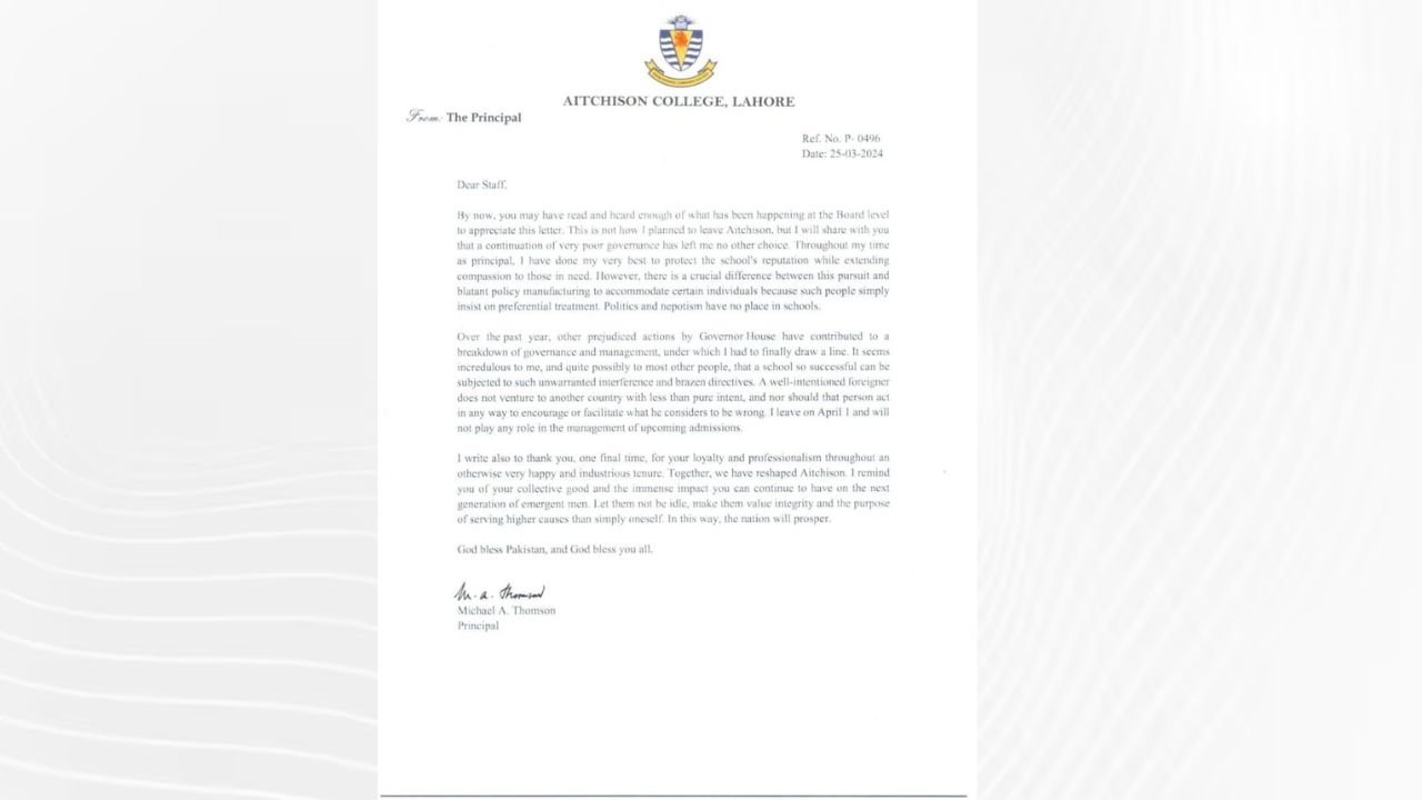 The principal of Aitchison College, Michael Thomson announced his resignation in a letter to staff and board members, stating that the Punjab Governor Baligh ur Rehman’s ‘biased actions undermined the school’s governance and management’.