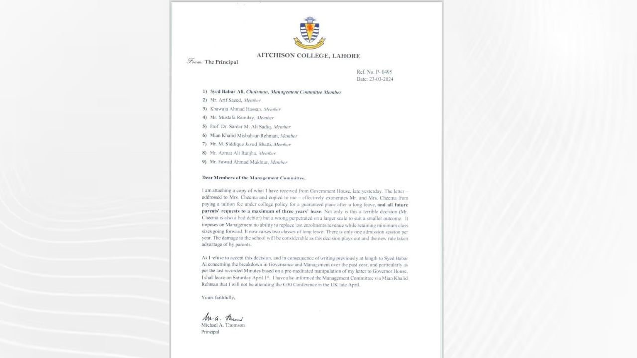 In his letter to the members of the management committee, Principal Thomson laid out that paying a tuition fee for a guaranteed place comes under college policy. The policy is applicable for long leave to a maximum of three years leave. He stressed that this request by Mr. and Mrs. Cheema is a “wrong perpetrated on a large scale to suit a smaller outcome.” He closed the letter by saying that he refuses to abide by the order and has informed Syed Babar Ali who is the chairman of the Management Committee. He asserted that he will not play any role in management and admissions after April 1.