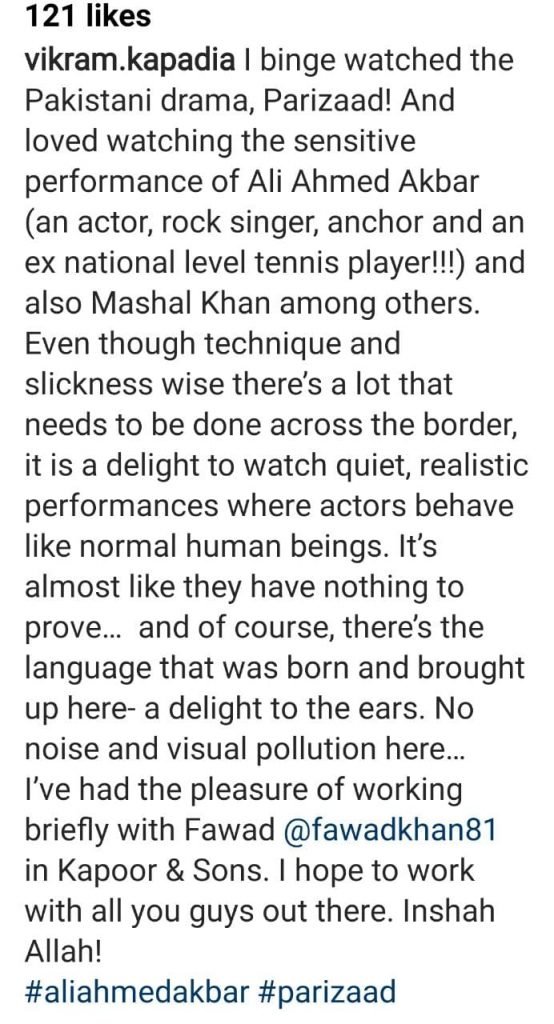 Now multiple Bollywood actors including Vikram Kapadia of Bazaar fame, Darshan Jariwala of Ajab Prem Ki Ghazab Kahani fame and Namit Das of Wake Up Sid fame indulged in an online chat about the drama, when the Kapoor & Sons star posted an appreciation note for the drama and it’s star Ahmed Ali Akbar.