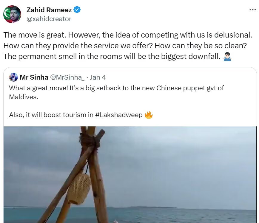 Rameez mocked Indians, stating that competing with the Maldives for tourism was “delusional.” He questioned how India could match the level of service and cleanliness offered by the island nation, adding that the permanent smell in Indian rooms would be a significant drawback.