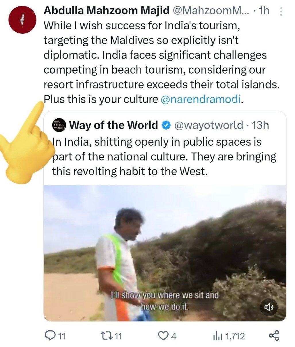 Deputy Minister of the Ministry of Youth Empowerment Maldives, Abdulla Mahzoom Majid, also criticised Modi and said, “While I wish success for India’s tourism, targeting the Maldives so explicitly isn’t diplomatic. India faces significant challenges competing in beach tourism, considering our resort infrastructure exceeds their total islands. Plus this is your culture @narendramodi.”