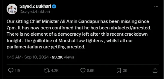 Earlier, Opposition Leader in National Assembly (NA) Omar Ayub Khan said that the federal government and establishment invited Gandapur to a cup of tea to discuss security concerns in KP; after that, his security staff and mobile phone went out of reach upon which rumours erupted of Gandapur’s possible arrest in Islamabad.